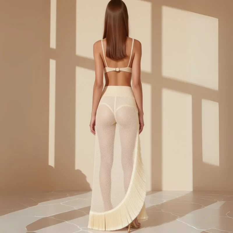 A refined women’s two-piece set designed for timeless coastal elegance and summer soirées. Featuring a structured bralette paired with a sheer maxi skirt finished with flowing fringe, it blends understated sophistication with statement detail. Perfect for seaside evenings or resort gatherings, styled with strappy heels and woven accessories.