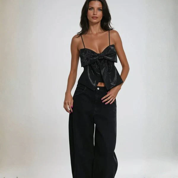 A women’s crop top featuring a statement oversized bow and a subtle shimmer finish for a modern, glamorous edge. The structured silhouette and delicate straps create a striking yet refined evening look. Perfect for pairing with tailored pants or sleek skirts for night-out elegance.