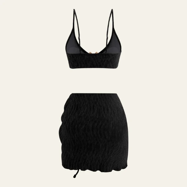A women’s three-piece resort set featuring a cropped bikini-style top, a coordinating ruched mini skirt, and matching high-waisted briefs. The ensemble is defined by a distinct crushed-velvet texture and adjustable drawstring detailing for a custom, sculpted silhouette. Ideal for beachside lounging, tropical vacations, or elevated poolside styling.